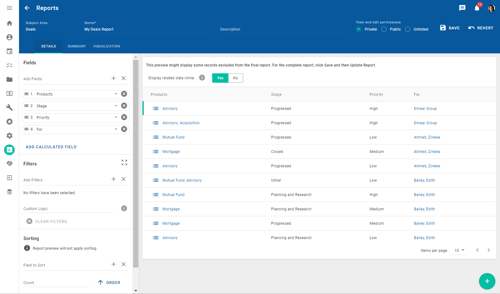 After you add a field, you can apply filters in the Details tab to include or exclude specific records from the report. For more information, see Creating new reports.