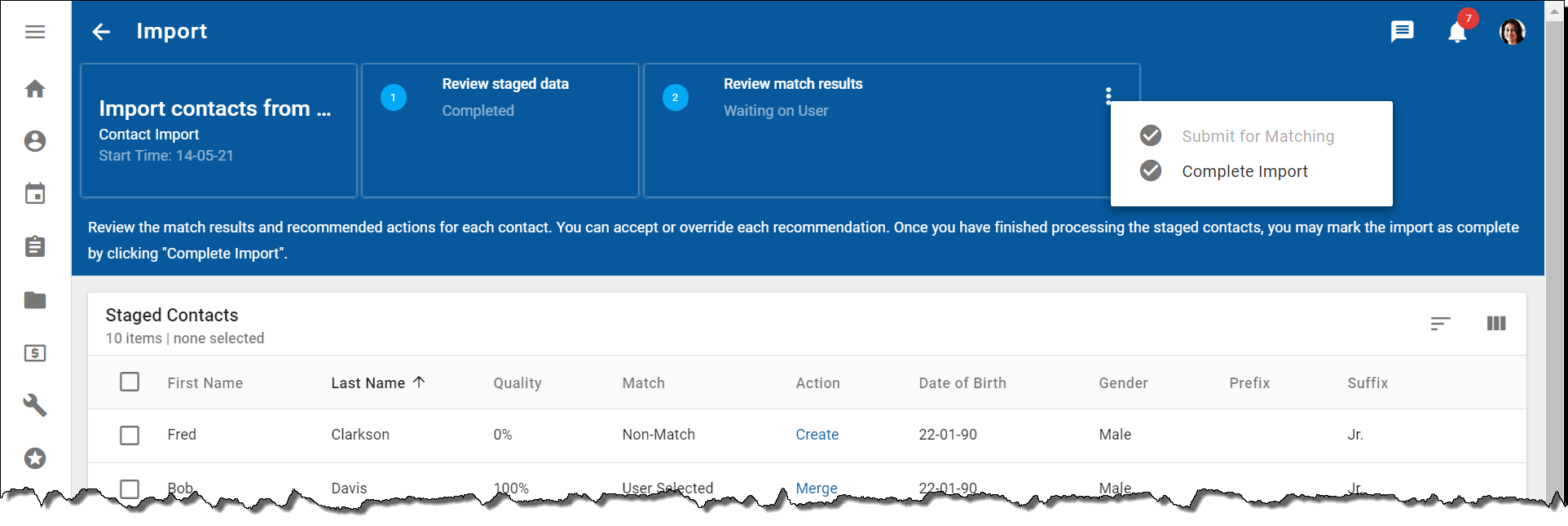 After the matching process has completed, you can review the match results, recommend actions for each record, and process the data.Import detail page