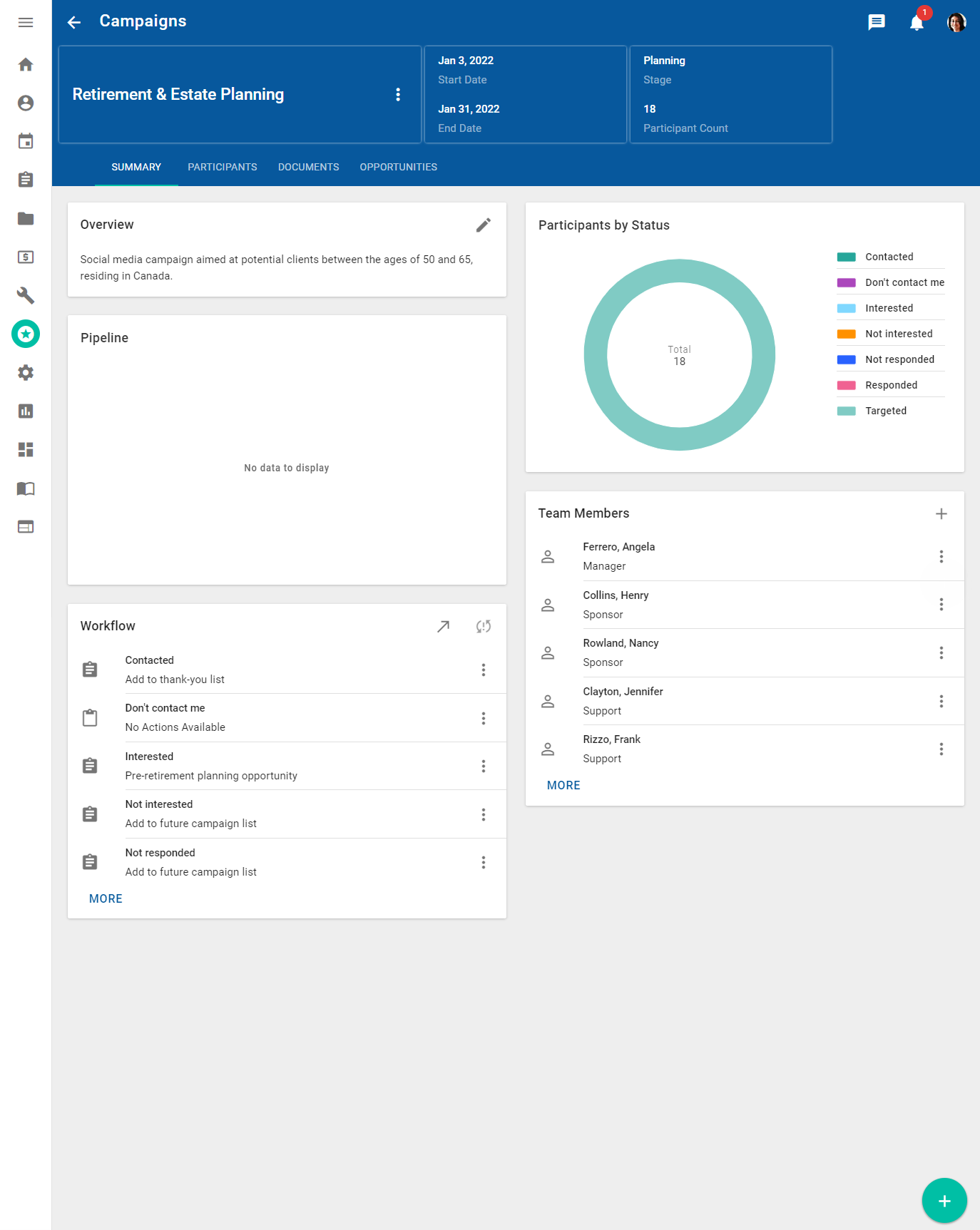 View and update additional details about the campaign, including the team members working on the campaign, supported participant statuses, and any notes associated with the campaign