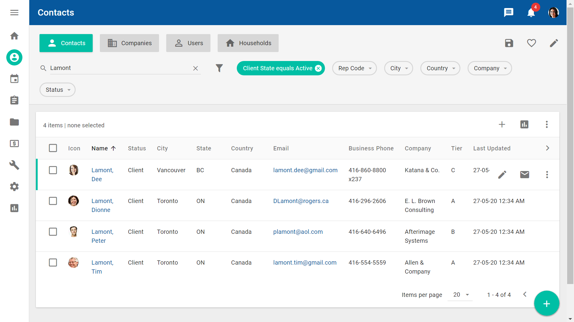 Click Save. The filter chip now displays Country equals Canada. The Contacts filter displays an asterisk because the filter has been modified. The records for all contacts that live in Canada display in the data table.