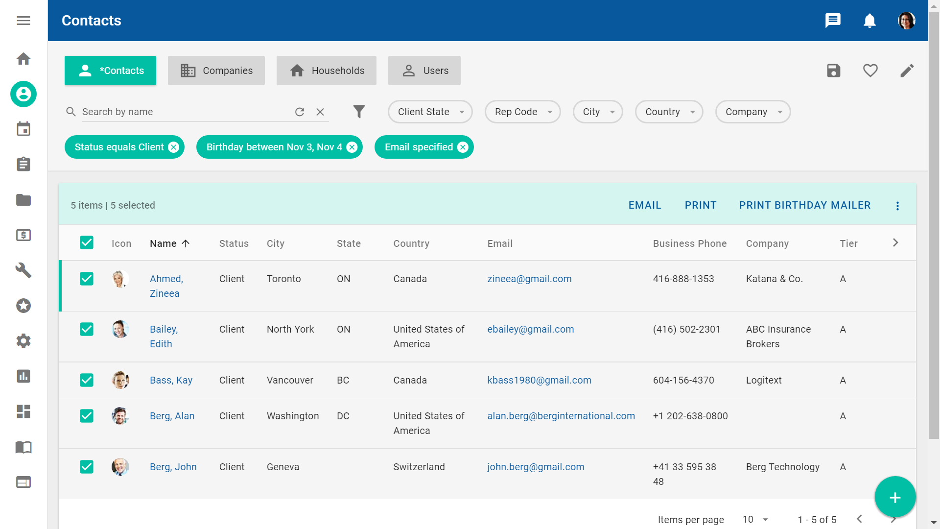 For example, you want to create a filter that includes your clients who have a birthday on November 3rd, and have email addresses specified in NexJ CRM, so that you can send a batch email.