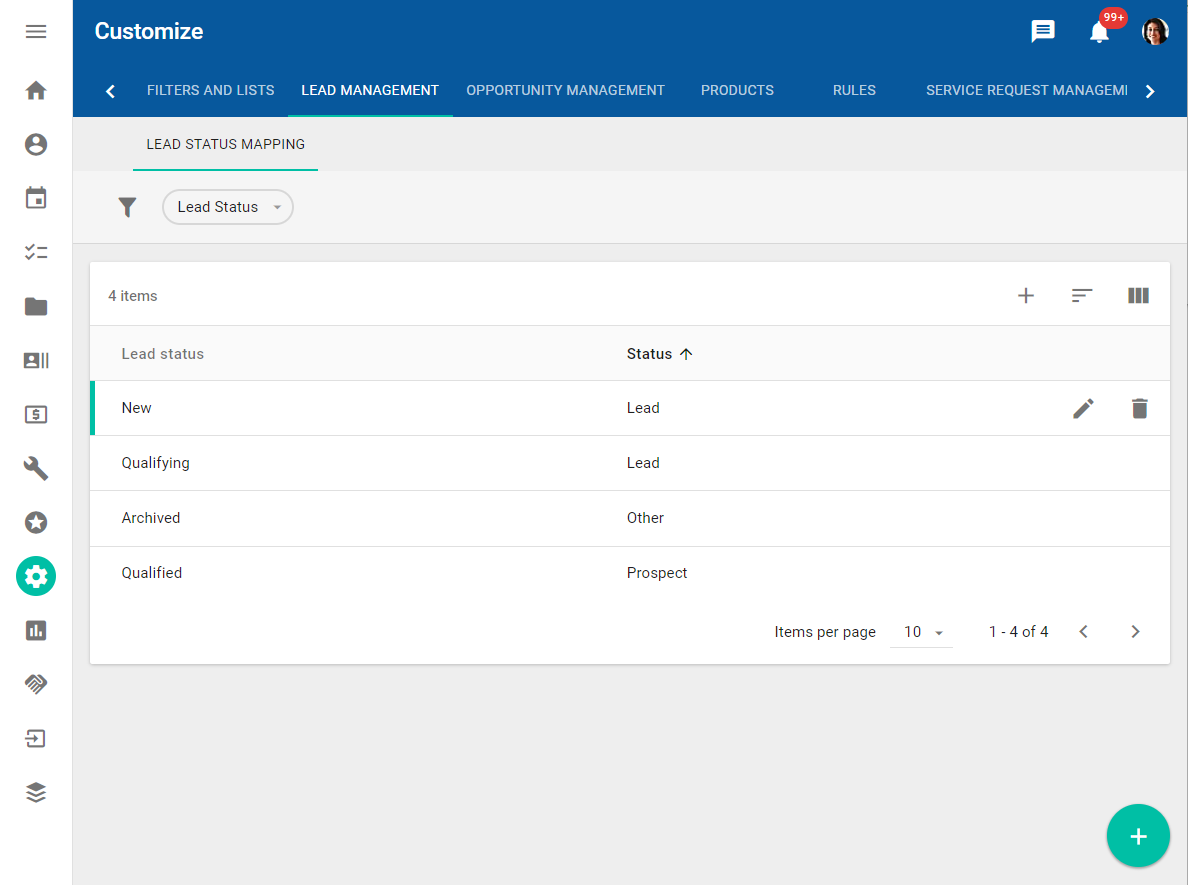 - To add a new mapping, click the Add button. Only one mapping can exist for each lead status, so this button is disabled with default values. However, if you have previously deleted a mapping, or if you have defined new custom lead statuses, you can use the Add button to create a new mapping.