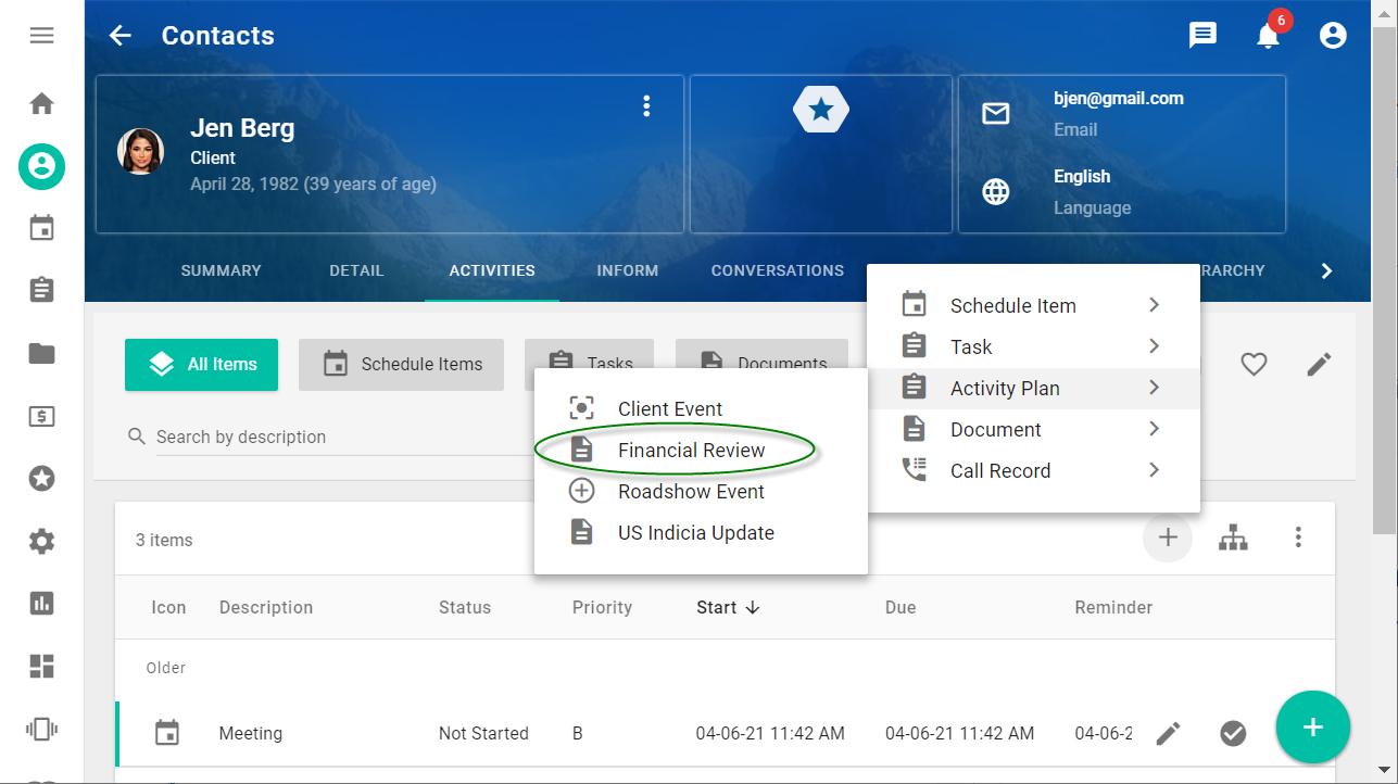 When you add a financial review activity plan to an individual contact, on the Activities tab of the contact's profile in the Contacts workspace