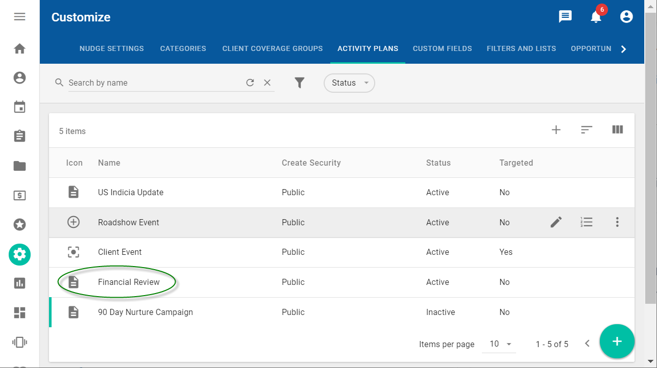 For example, to add a financial review activity plan to a contact, you must already have a financial review activity plan template with defined steps. You can create activity plan templates using the Activity Plans tab on the Customize workspace