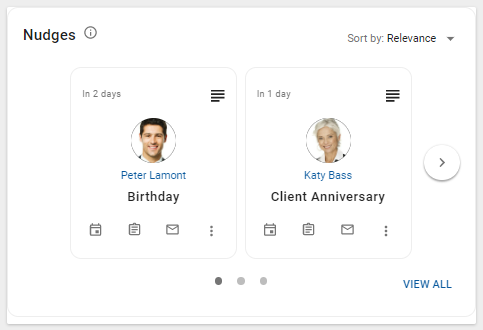 displays only the most urgent active nudges for your clients. You can sort these nudges by relevance or due date, and navigate between the nudges by clicking the left