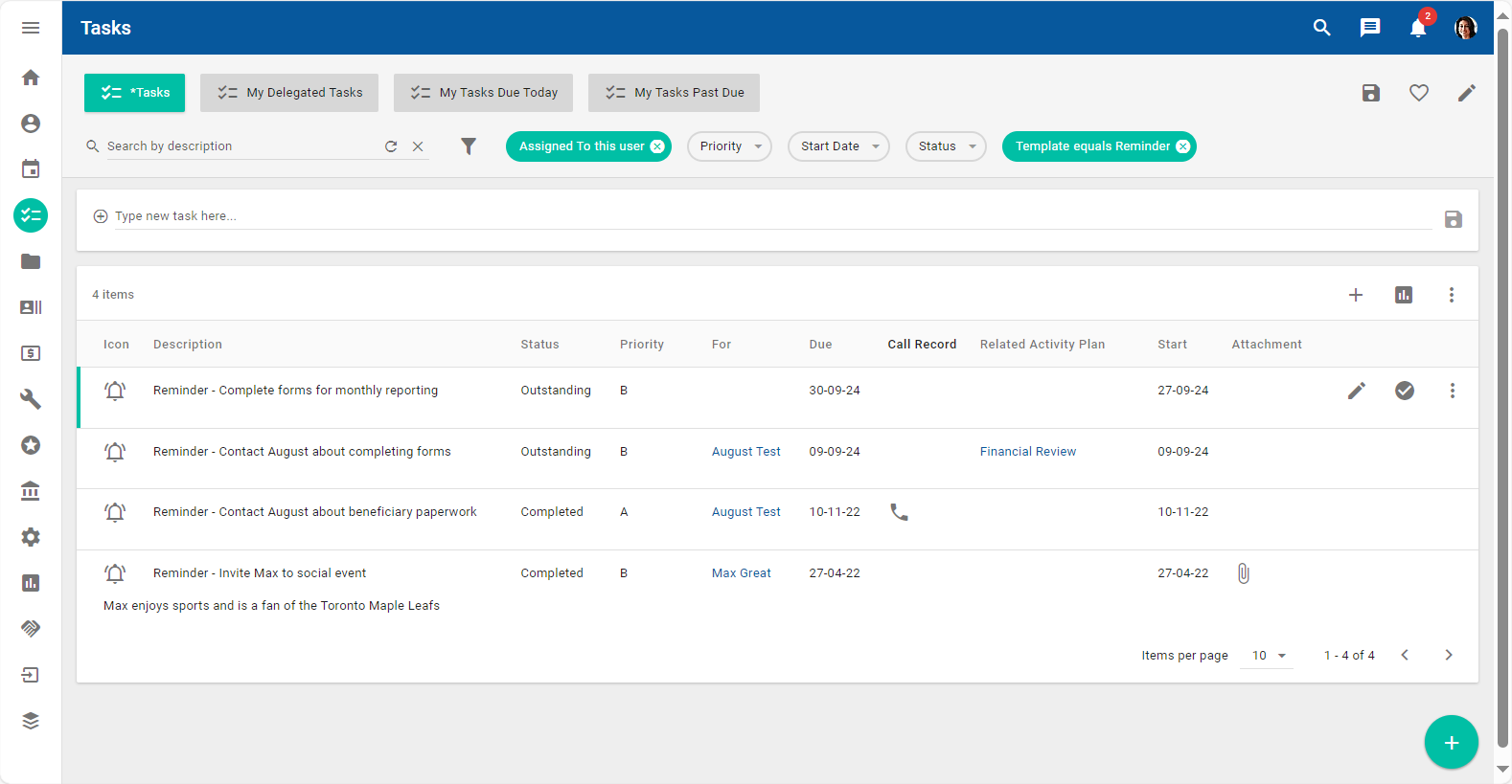 A task is a type of activity, assigned to one or more users, that does not need to occur at a defined time. The Tasks workspace enables you to leverage search and filter capabilities, display more information in a larger working space, and manage tasks. For example, you can add a follow-up task on the Tasks workspace when further actions are required by one or more users after a meeting with a contact. You can then modify the task as required and, when the task is done, mark the task as completed.