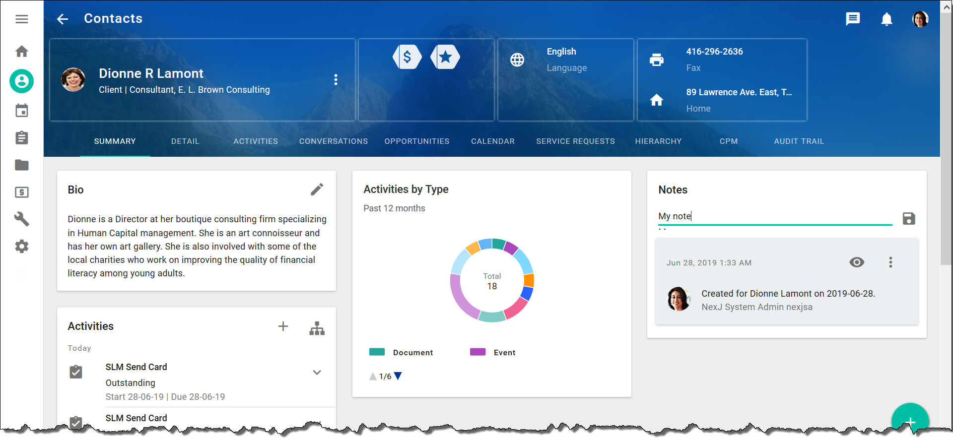 In the Summary tab, enter a note on the Notes card in the Type new note here field. For example, enter: My note.