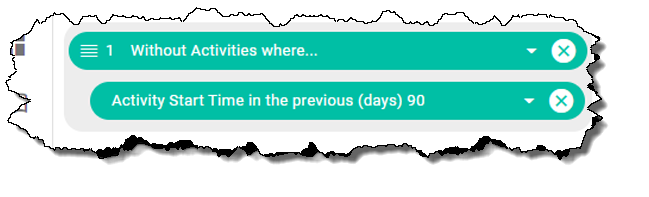 You can change an associated filter so that it excludes data in the report that matches the filter criteria by clicking on the associated filter name in the filters list in the Details tab, and selecting the WITHOUT option in the Configure Filters dialog. For example, the following associated filter for a Contacts report will exclude contacts that have associated activities that start in the last 90 days: