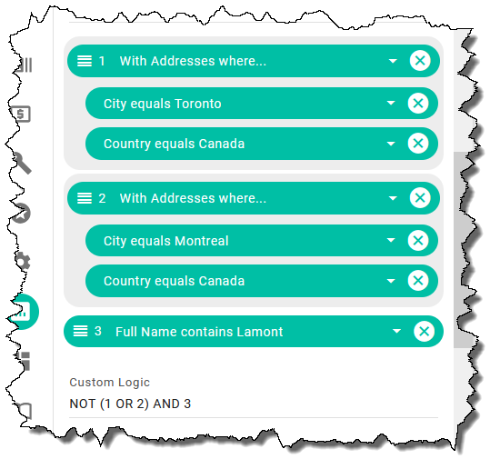 The following shows an example of a custom logic expression that will not include data in a contacts report for contacts who have an address in Toronto or Montreal, and will include data for contacts that have addresses in other cities when their full name contains "Lamont":
