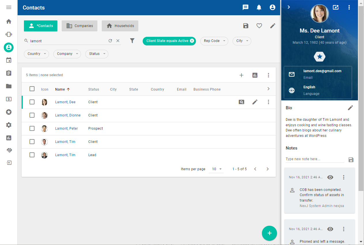 For more information about search and filter functionality, see Searching and filtering in NexJ CRM.