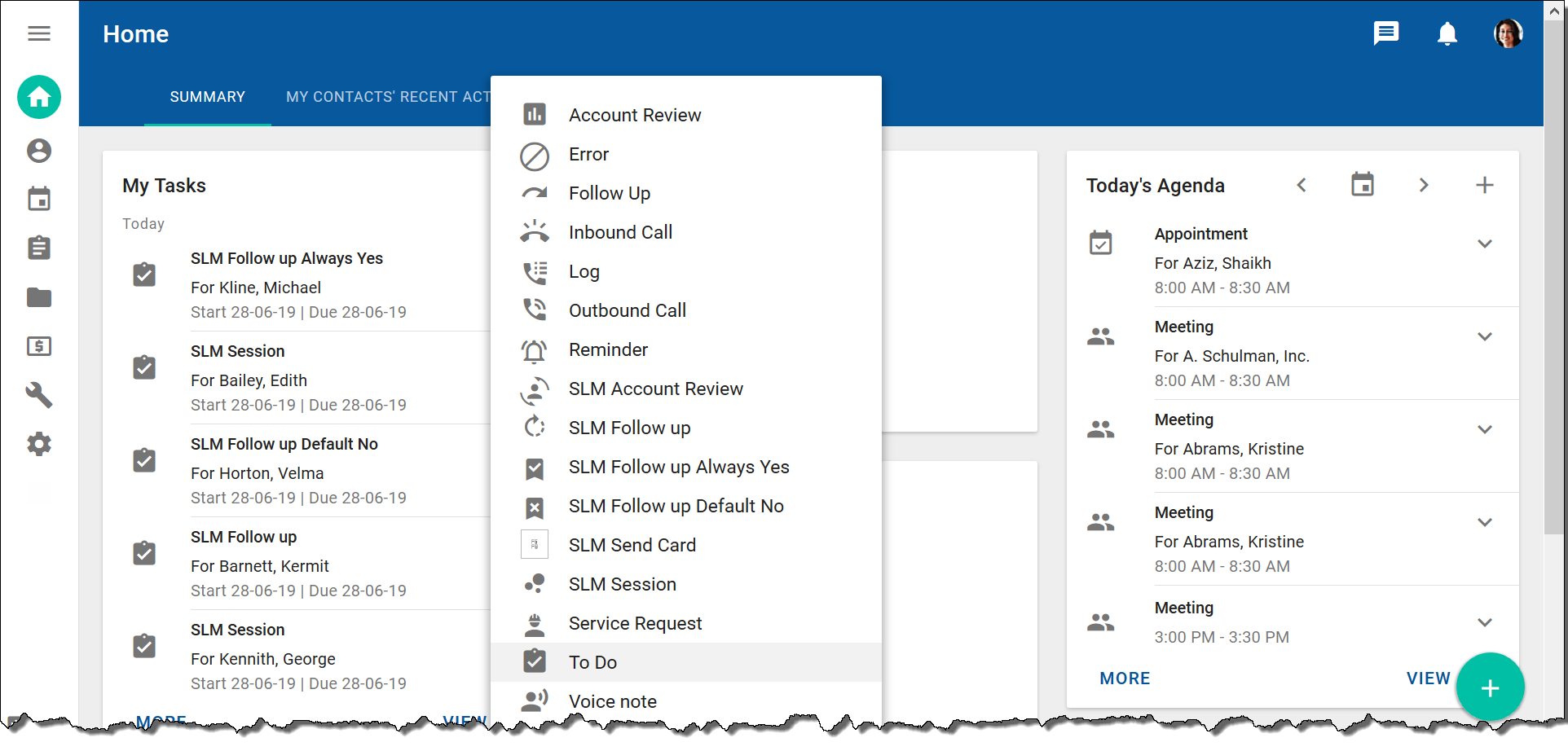 For example, to create a To Do task from the Home workspace for a contact and delegate it to Cheryl Elms:
