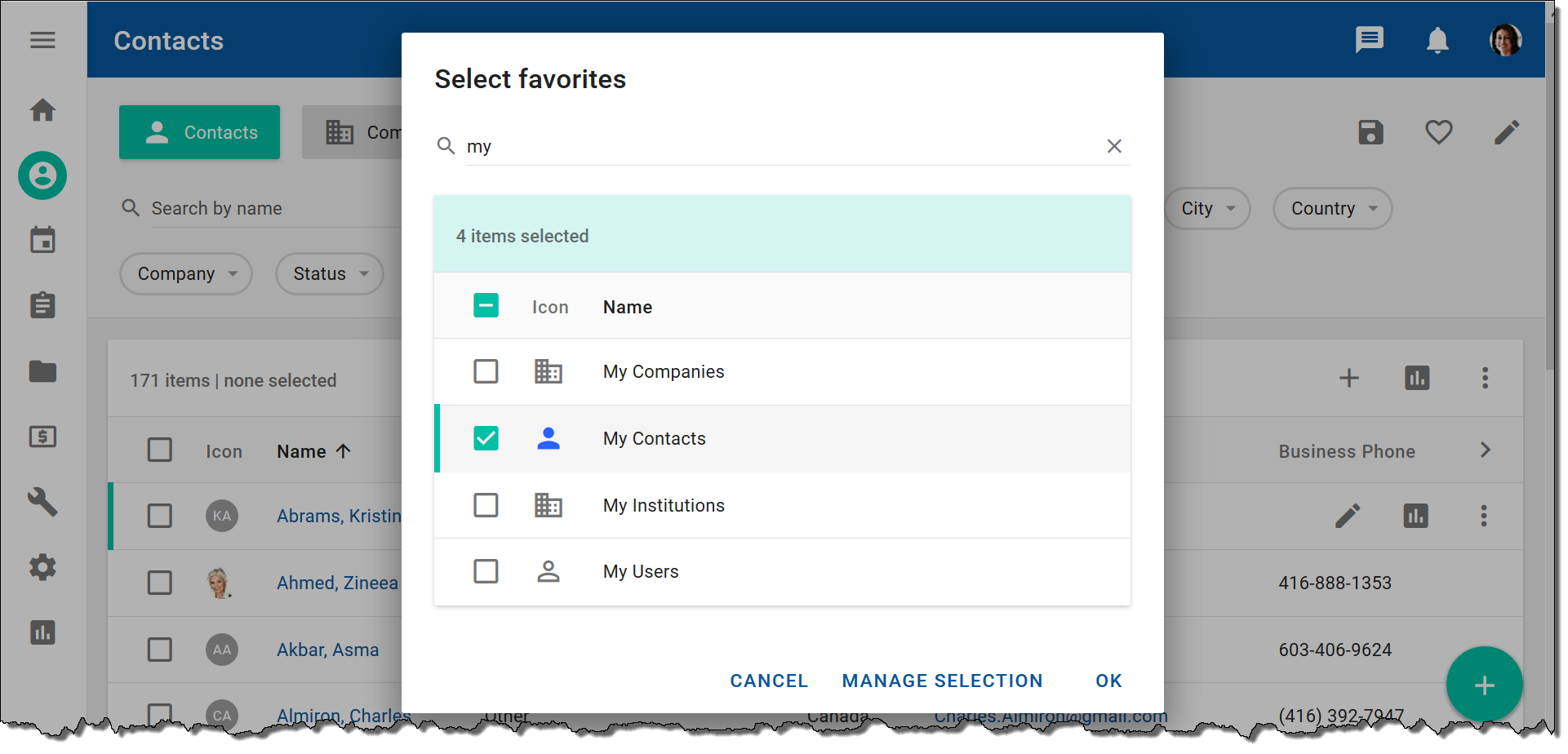 2. Enter my in the text search field and select the checkbox for My Contacts.