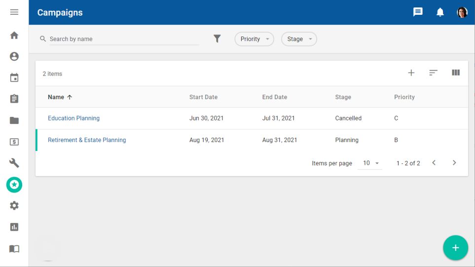 The Campaigns workspace displays a data table that shows all data records matching a specified filter criteria. You can filter the table to refine what records are shown or search for specific campaigns. Use the Campaigns workspace to navigate between records and to add, view, and manage campaign information.