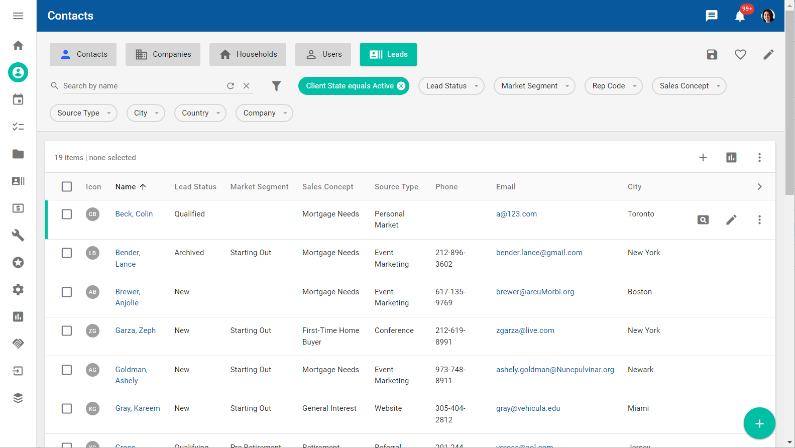 In Integrated Lead Management, a lead is an entity similar to a contact, which can be managed through a list within the Contacts workspace. The experience working with a lead is identical to that of working with any other contact. For example, any activity type can be created for a lead. Creating a lead and progressing it to a prospect or client is a seamless process. This topic contains information about using the Integrated Lead Management feature.