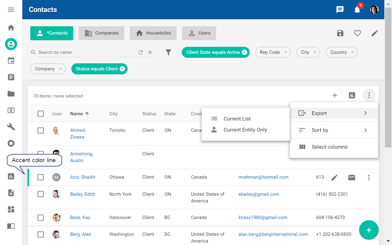 To export data for a single entity, click the entity record row, so that it is highlighted by an accent color line on the left to select it, and verify that the checkbox for the record is cleared. The following image shows the accent color line.