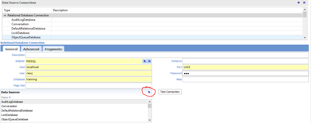 We need to make our Environment file aware of our new datasource. Click the set current server button and navigate to the Data Source Connections bottom tab. Select the Relational Database Connection and press the arrow in the lower Data Sources list.
