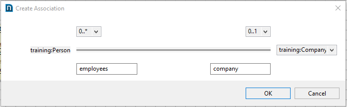 Here, we extend the training:Entity model by creating two new classes: training:Person and training:Company. training:Company will have a 0-to-many association with training:Person: each person can have only one associated company but each company can have any number of associated people as employees.