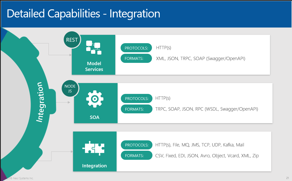 • Integration Services provide the most flexibility for custom service development. They are capable of sending and receiving over HTTP(s), file drops, message queues, TCP, UDP, kafka, and mail protocols. Supported wire formats include comma-separated value, tab-separated value, fixed or copybook, EDI, JSON, Avro, Object, vCard, XML, SOAP, and Zip. Orchestration is visually declared and can support virtually any integration pattern, for example, content based routing, ESB or point-to-point, synchronous or asynchronous. It also supports advanced capabilities for SSO, entitlements, and certificate authentication.