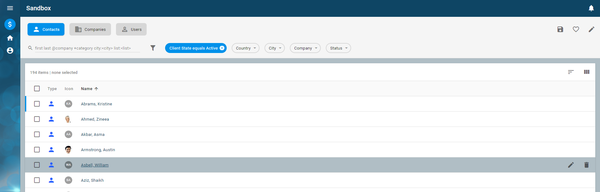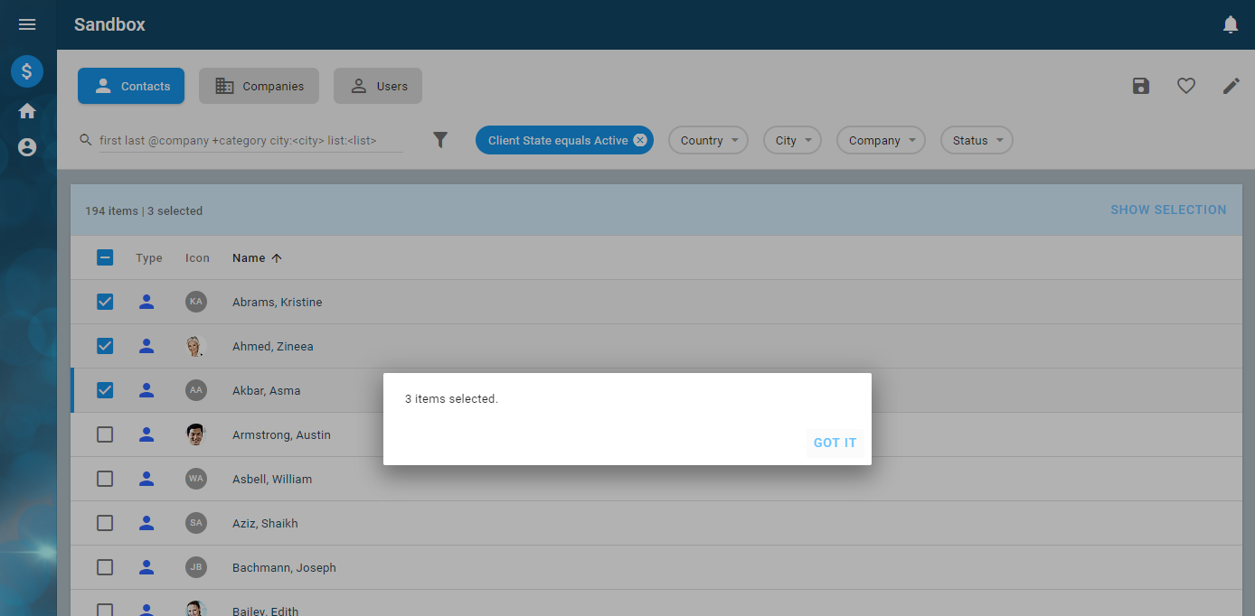 XML... <Column caption="idsa.training.layout.EntityList.type" icons="type iconDefault" name="colType"/> <Column caption="idsa.training.layout.EntityList.icon" icons="(image . image)(data . mimeData)(type . mimeType)" name="colIcon" texts="initial"/> <Column caption="idsa.training.layout.EntityList.name" event="sysDetail" length="100" name="colName" customizable="#f" values="fullName" visible="#t"/> <Column caption="ids.Email" case="PSN" name="colPEmail" sortable="false" values="email fullAddress"/> <Column caption="ids.phoneNumber" case="PSN" length="20" name="colPAddress" sortable="false" values="workPhone fullAddress"/> <Column caption="ids.company" case="PSN" name="colFullCompany" values="companyName"/> <Column caption="ids.caption.lastUpdated" case="PSN" name="colPLastUpdated" values="editTime"/> <Column caption="IDS_LANGUAGE" case="PSN" name="colPLang" values="defaultLang caption"/> <Column caption="ids.city" case="CO" name="colBranch" values="defaultAddress city"/> <Column caption="IDS_TELEPHONE" case="CO" name="colCompAddress" sortable="false" values="workPhone fullAddress"/> <Column caption="ids.caption.lastUpdated" case="CO" name="colCompLastUpdated" values="editTime"/> <Column caption="ids.caption.lastUpdated" case="USR" name="colULastUpdated" values="editTime"/> ...- Reload the application. You should see the columns on the table change as you click from one filter card to the next. The following example shows the columns for contacts, which are of the