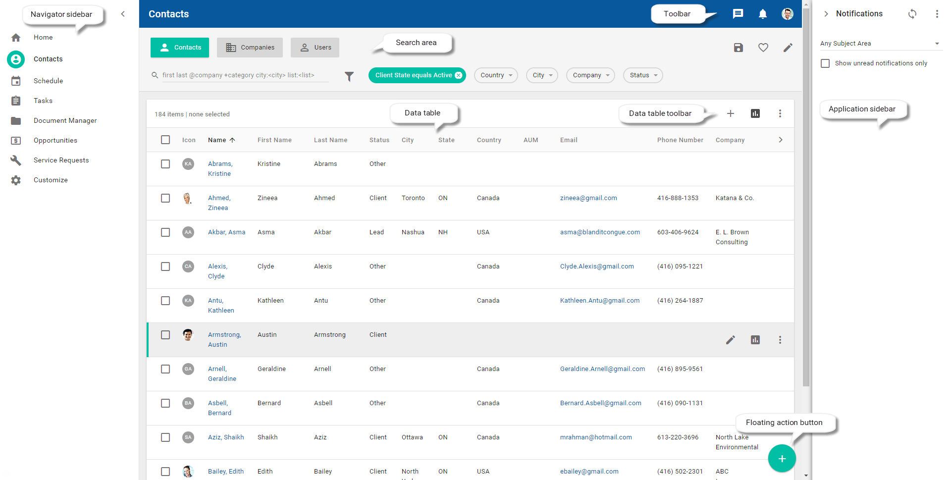 Floating action button, sidebars, cards, and data tables