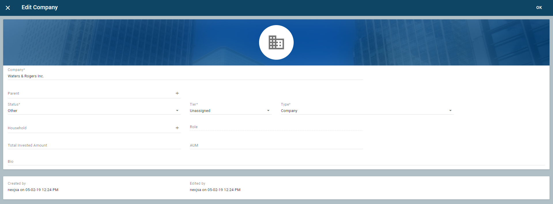 Save your work, restart your server, and reload the UI. When you select a row in the list, the Edit button displays at the right side of the row. Click on it and a dialog opens with "Edit a <className>" where className is the type of the row you are on (for example, company, user, or person).