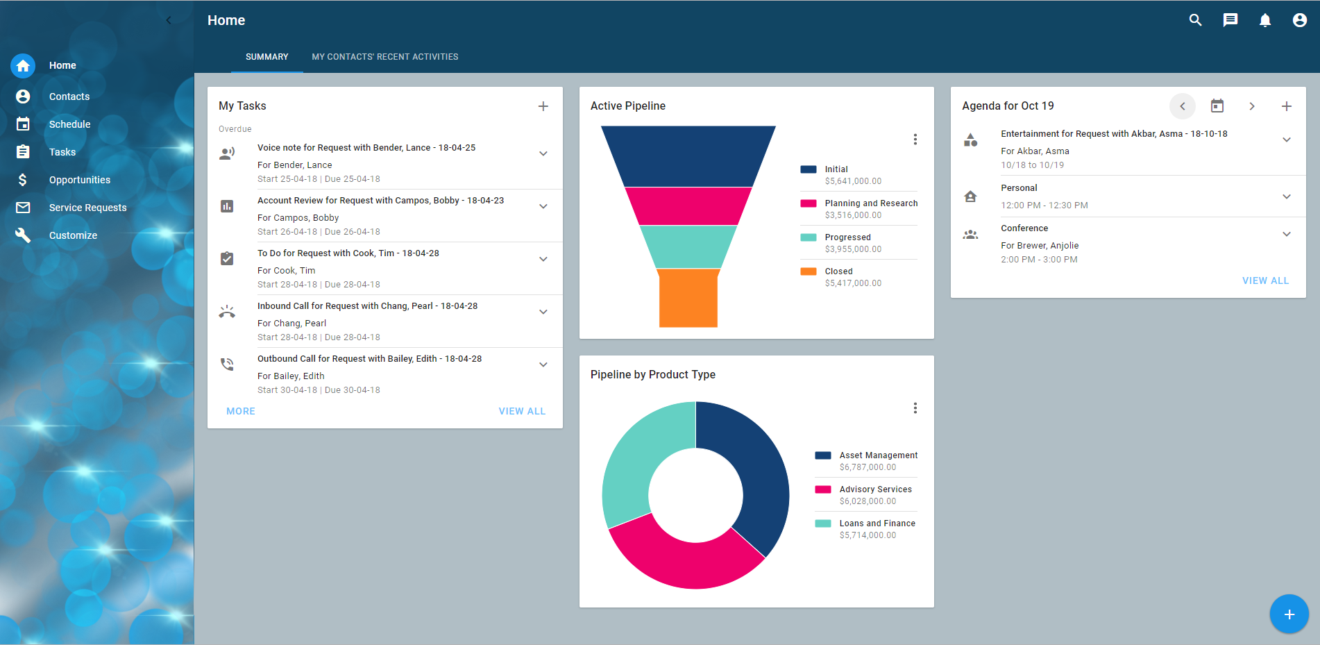 They can be hosted in a NexJ Portal application, injected into a web page, run standalone, or hosted in other UI platforms (for example, a major bank runs them in the Thompson One framework). Although web page templating and embedding portlets in other portals will be covered in this training, the focus will be on portlets running in a NexJ Portal application. The Portal arranges portlets into workspaces, pages, and tabs. Here is an example of a Home workspace with four portlets and two tabs.