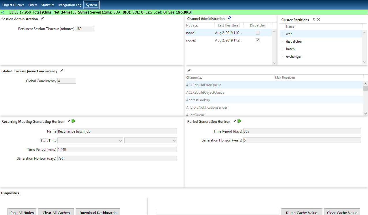 The System page in NexJ System Admin Console enables you to manage session timeout settings, global process concurrency settings, recurring schedule items, message queues, the frequency for generating new periods, and monitor the health of your application server clusters.