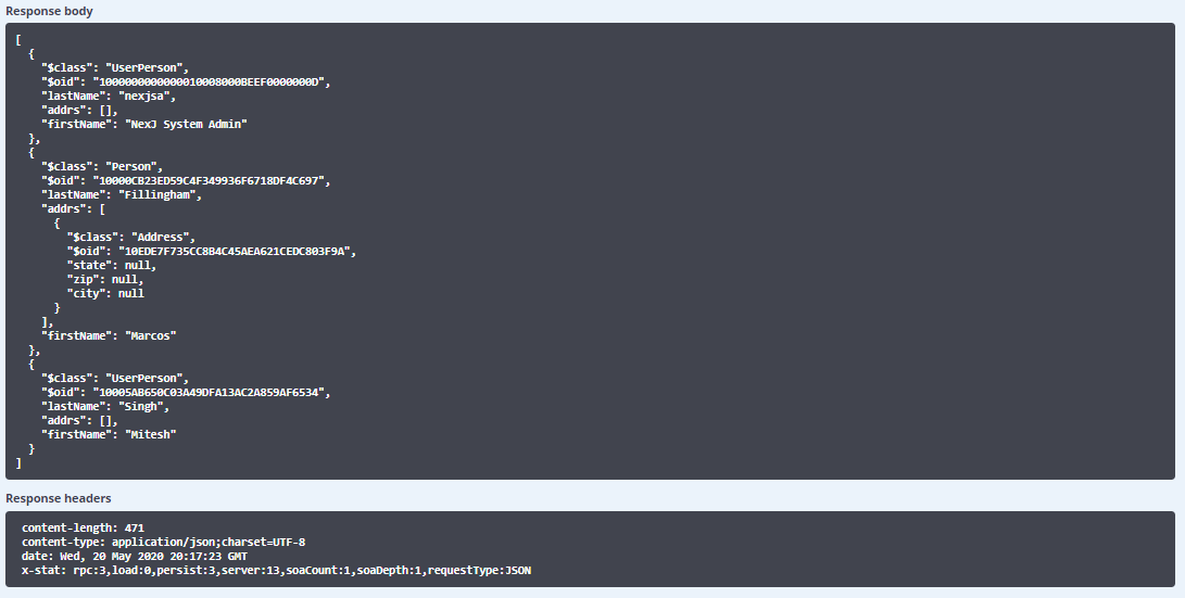 For example, to use the rest/json endpoint to retrieve (read) all contacts with a last name of Lamont and display their first name, last name, and addresses in JSON, issue the following GET request in the address bar of your browser: