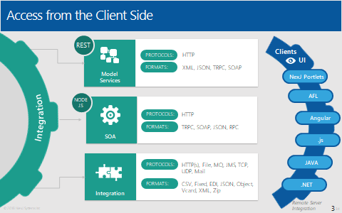 The basic building blocks of the interface are called portlets. They may be declarative portlets (also known as MDA or Model Driven Architecture portlets), AFL portlets using AFL JavaScript libraries, or portlets built using any other platform that can produce HTML, CSS, and JavaScript. Portlets get their data through the integration layer which in turn calls the logic of the business model, usually using model services. They are usually hosted in the NexJ Portal but may also be surfaced in other portal servers. Portals receive and communicate their context and events over the context bus.
