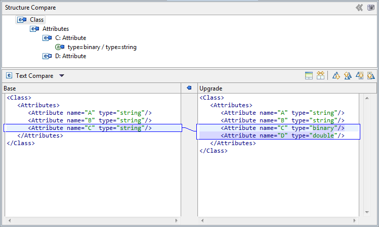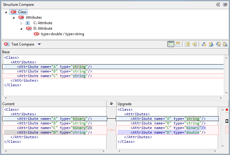Similarly, when you open a comparison between the base and upgrade models, the comparison editor displays resource source code and structure for both models. In this case, however, none of the panes are editable, because you cannot make changes to base or upgrade models. In the following image, the upgrade changes the type of attribute C and adds a new attribute D.