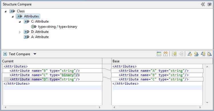 When you open a comparison between the base and current model, the comparison editor displays source code for both models. For structured resources, a Structure Compare frame gives you an expandable view of the changes in the resource. Double-clicking the changes in the Structure Compare frame focuses the Text Compare frame on the changes to that part of the resource. The Current section of the Text Compare frame allows you to edit the model source directly.