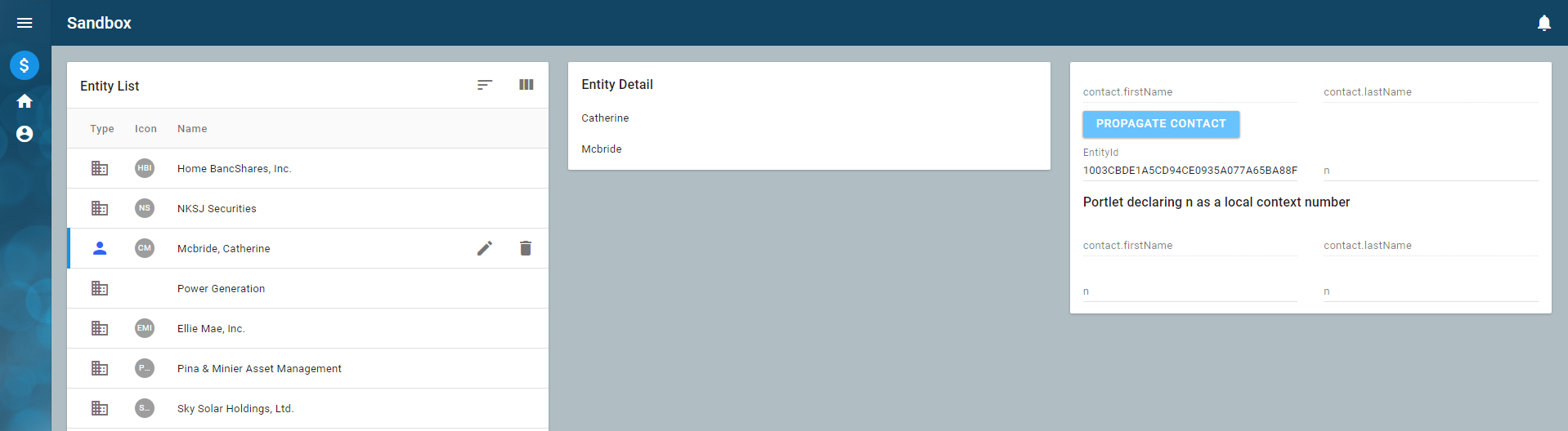 - Re-seed and refresh your browser. As you click through the list, you should see the Entity Detail portlet updating its values to match the selected entity.