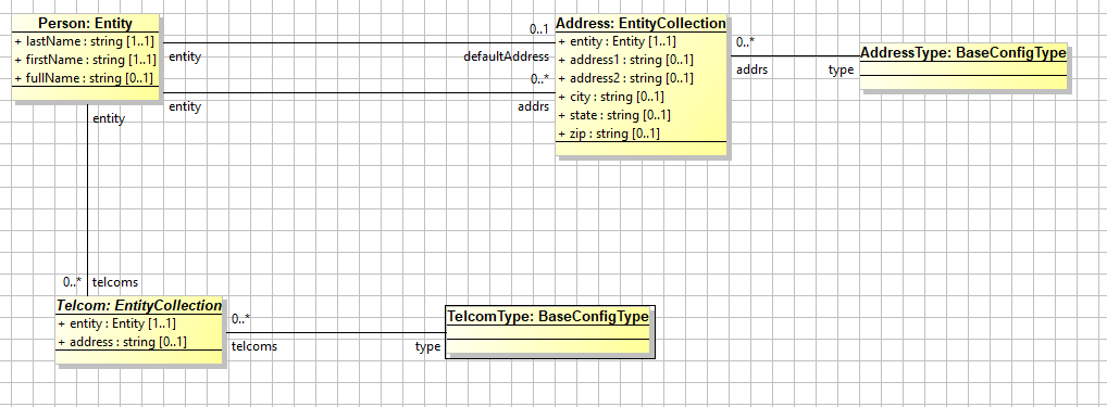 Use paths to navigate the business model and to access the content you want to include in your UI or report. Start a path from a particular point of view, for example, a class in the business model, or a view in the UI (that can also be bound to a business model class). The following class diagram shows examples of paths between classes (also known as associations), and are represented by the connecting lines. For example, one path shows how a Person class can have multiple addresses that have multiple address types (for example, home address, business address, and so on). The diagram also shows that a person can have many telcoms that each have types.