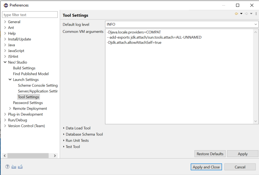 - In NexJ Studio, click Window > Preferences, and click NexJ Studio > Launch Settings > Tool Settings.
