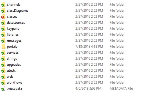 meta folder - contains a subfolder for each type of element in the model e.g. classes, portlets, messages, datasources Each of these folders contain XML files that represent your design e.g. Account.meta, EntityList.portlet, Account.message, Inventory.channel. Deeper subfolders contribute to the namespacing of elements e.g. the meta/portlets/lead/Banner.portlet file becomes the lead:Banner portlet.