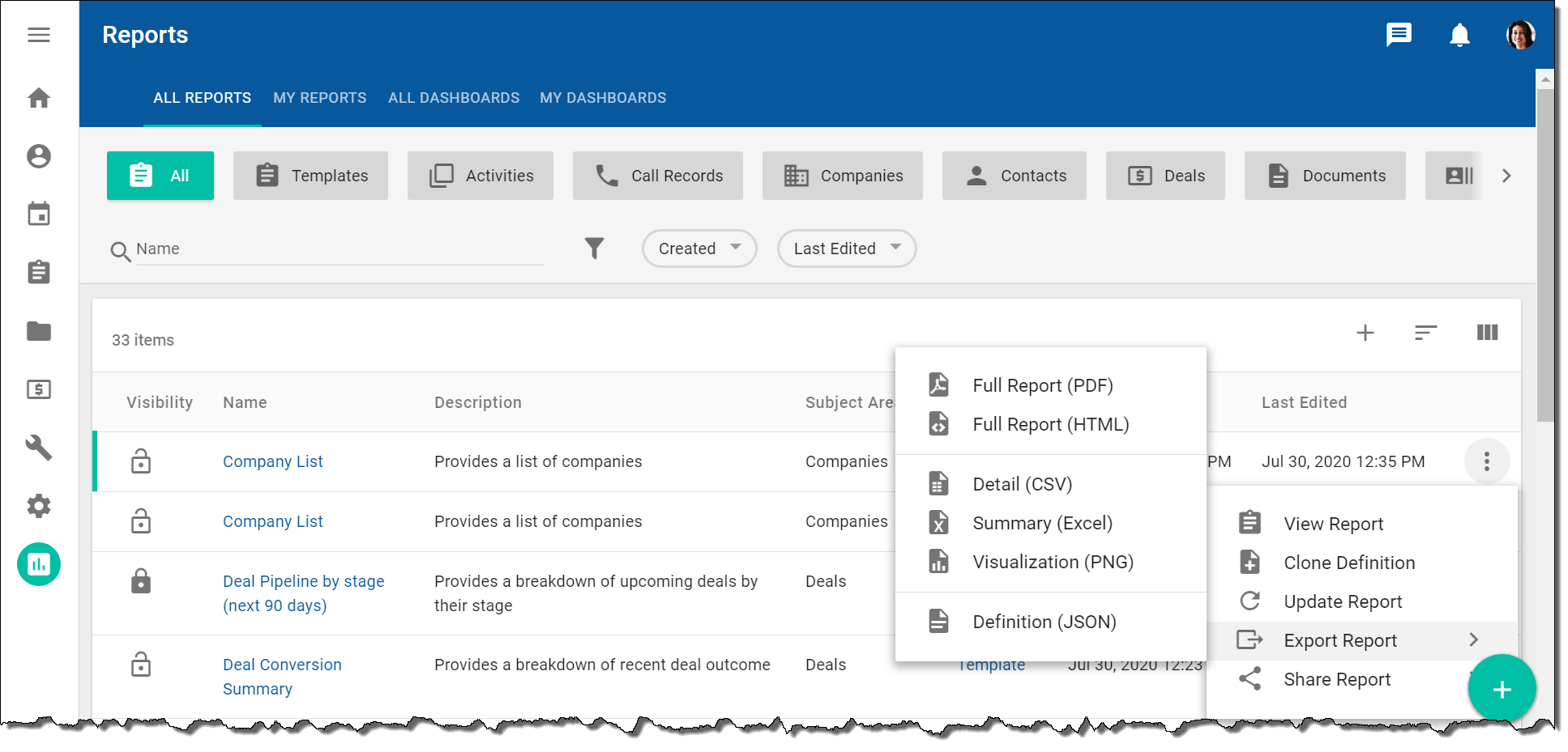 As of NexJ CRM 9.6, you can export individual reports in PDF format.
