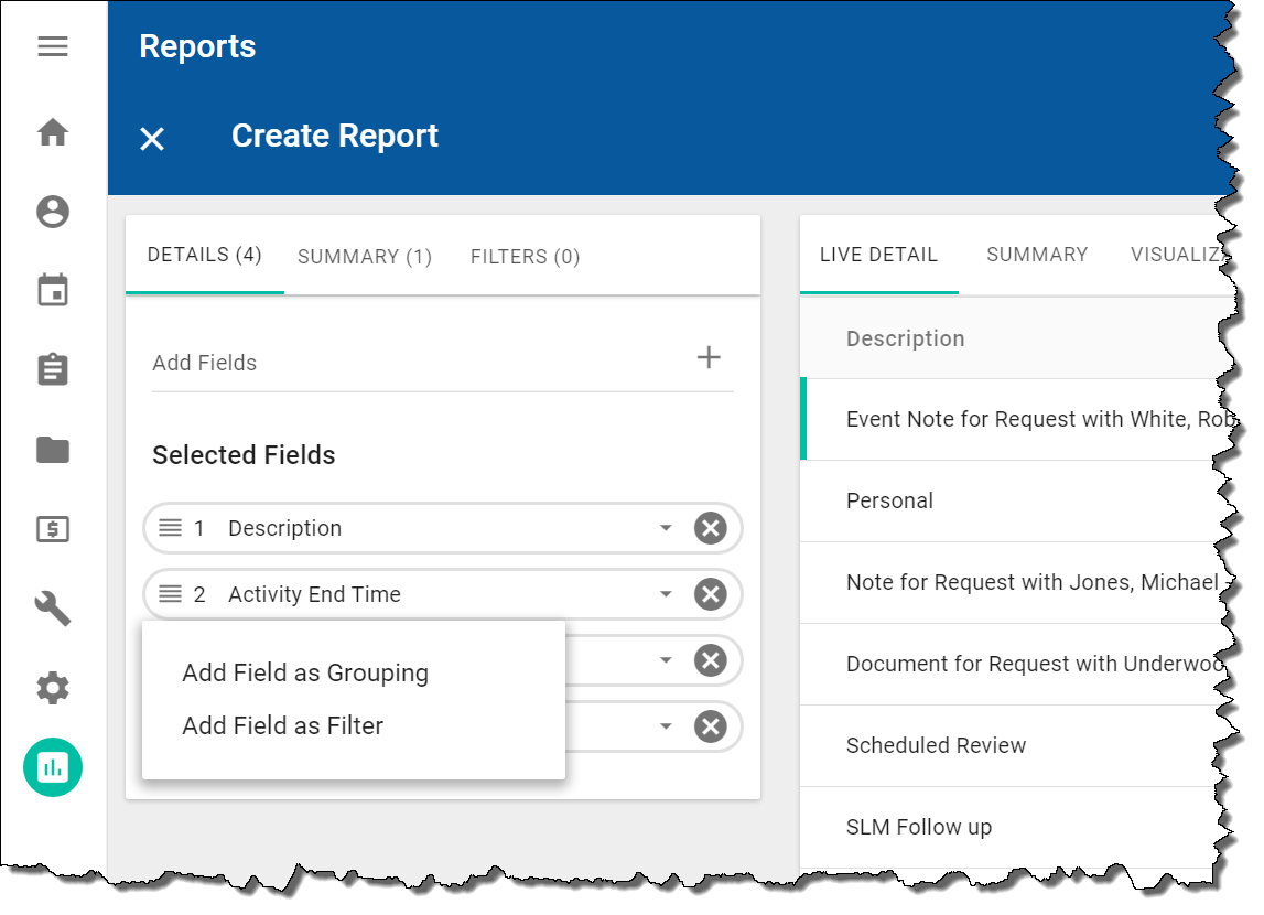 In the Details tab, you can quickly add fields as groupings or filters by selecting a field (for example, Activity End Time) and selecting either the Add Field as Grouping or Add Field as Filter menu option. The following screenshot shows the new menu options.