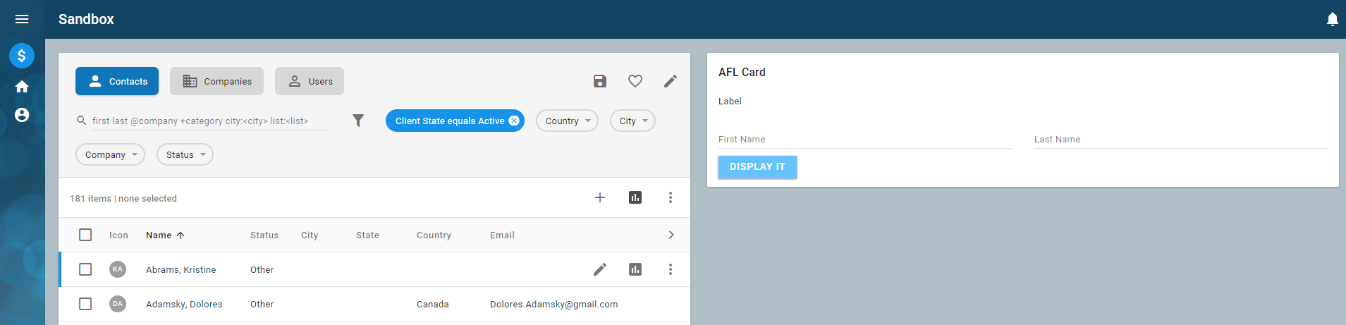 JS/** Example AFL Portlet */ define("app/myportlet", ["nexj/sys", "nexj/ui"], function(sys, ui) {"use strict"; return function() { return ui("Portlet", {children: [ ui("Card", {caption: "AFL Card", layout: {cols: 4}, children: [ ui("Label", {caption: new ui.Value("Label"), layout: {span: 4}}), ui("Text", {value: new ui.Value(), caption: "First Name", layout: {span: 2}}), ui("Text", {value: new ui.Value(), caption: "Last Name", layout: {span: 2}}), ui("Button", {caption: "Display It", layout: {span: 2}}), ]}) ]}); }} )Save your work.