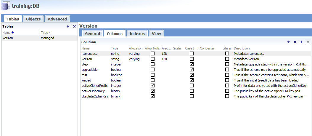 <Table aspects="!LOCKING !PARTITIONED" name="Version" primaryKey="Version.PK" type="managed">