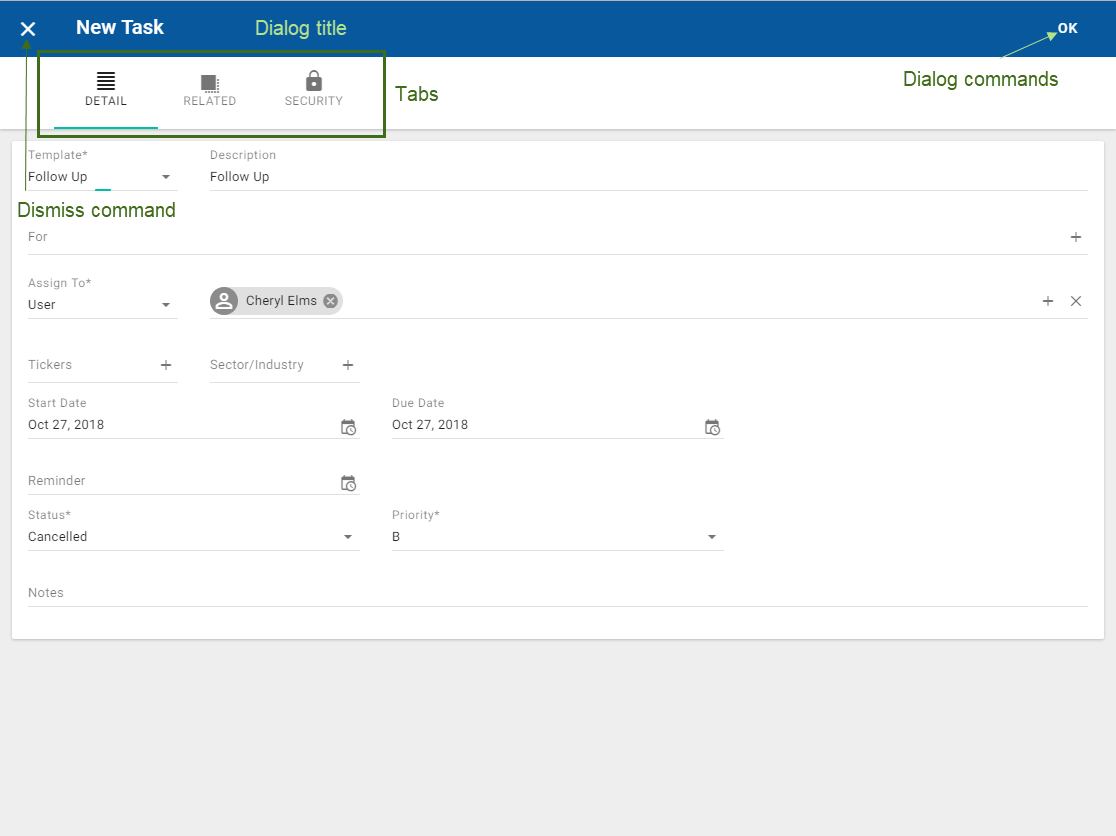 Complete the fields in the dialog and click OK or the appropriate dialog command.