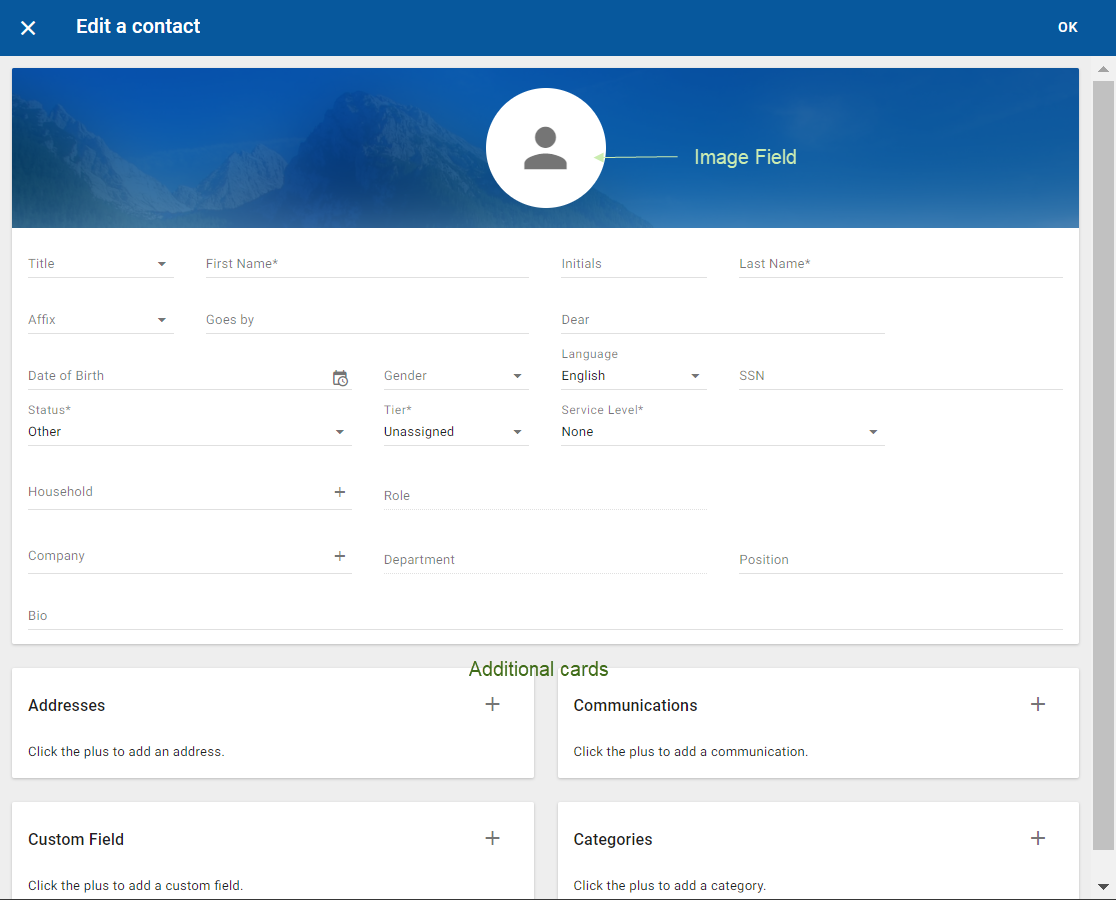A separate card for adding an image to an object can be included.