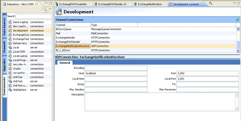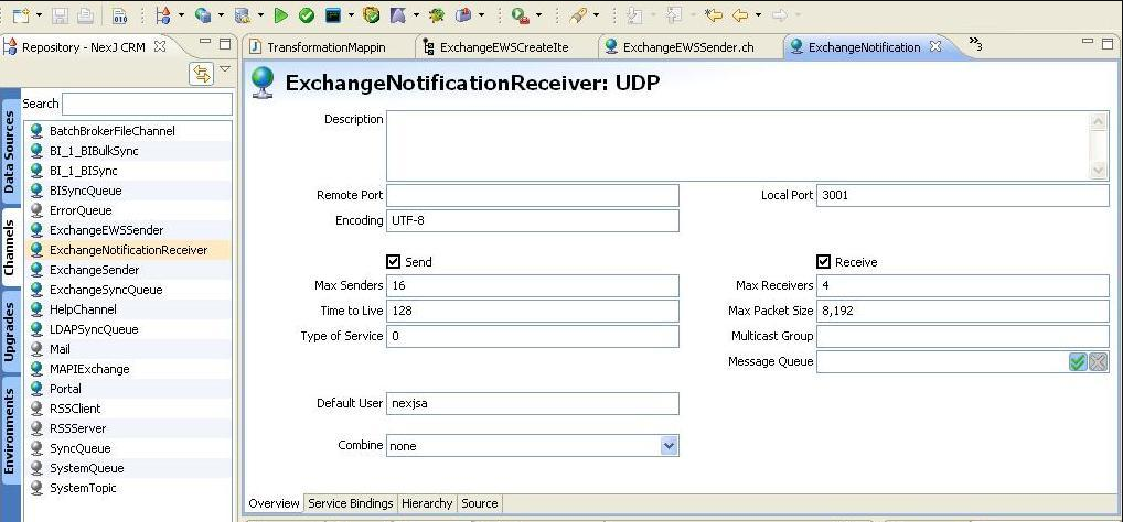 Every external system with which we synchronize is modeled as a synchronization target. A synchronization target specifies the service to which to send outbound messages, and a bunch of configuration parameters. In the Exchange synchronization code, we have a subclass of SysSyncTarget on which we put additional information, such as the channels on which to send and receive Exchange messages.