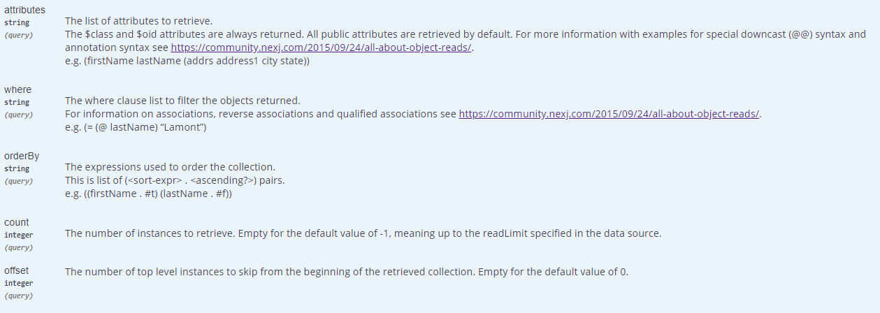 Try out some of the other get parameters in your browser i.e. attributes, where, orderBy, count, and offset. You will also want to put &$indent in the URL as well so your output is more readable.