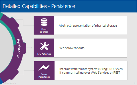 The Persistence layer enables you to model physical storage including data sources, upgrades, data extracts (dumps), and ETL activities.