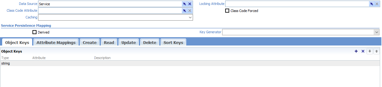 You should see the Service Persistence Mapping editor with tabs for Object Keys, Attribute Mappings, Create, Read, Update, Delete, and Sort Keys. Let's discuss some of the properties of a service persistence mapping.