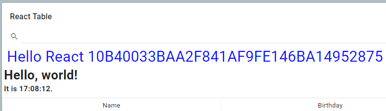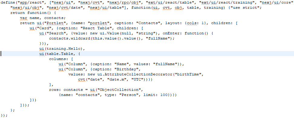 JSdefine("app/react", ["nexj/ui", "nexj/cvt", "nexj/rpc/obj", "ext/ui/react/table", "ext/ui/react/training", "nexj/ui/core", "nexj/ui/obj", "nexj/cvt/date", "nexj/ui/table", "nexj/ui/bus"], function(ui, cvt, obj, table, training) {"use strict"; return function() { var name, contacts; return ui("Portlet", {name: "portlet", caption: "Contacts", layout: {cols: 1}, children: [ ui("Card", {caption: "React Table", children: [ ui("Search", {value: new ui.Value(null, "string"), onEnter: function() { contacts.wildcard(this.value().value(), "fullName"); }}), ui(training.Hello, {name: "React", text: new ui.ContextValue("EntityId")}), ui(table.Table, { columns: [ ui("Column", {caption: "Name", values: "fullName"}), ui("Column", {caption: "Birthday", values: new ui.AttributeCollectionDecorator("birthTime", cvt("date", "date.m", "UTC"))}) ], rows: contacts = ui("ObjectCollection", {name: "contacts", type: "Person", limit: 100})}) ]}) ]}); }; });When