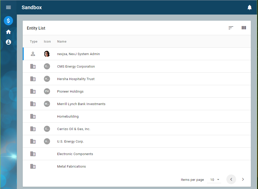The table in this layout is bound to the Entity class. Entity is subclassed into Person and Organization which are subsequently subclassed into UserPerson, Company, and Department. The image displayed in the type column is based on the type of class.