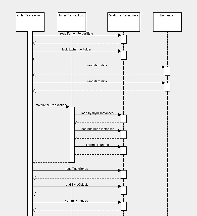 The first action on each nested transaction is to lock the ExchangeFolderLock associated with the folder, to prevent Exchange update operations from conflicting with other synchronization processes (inbound or outbound). The second action is to read the SyncObjects table, to verify that SyncObjects about to be created have not already been created by another outbound process. The updates (derived from the ObjectMessages) are sent to Exchange in one or several service requests. Interleaved with these service requests, reads may be done on synchronization metainformation that was not previously identified as relevant by the system. All involved syncObjects and syncGroups are updated with the identifiers and versions returned by Exchange. Finally a transaction listener fires to move any draft invitations to the outbox in Exchange, causing them to be sent. In the event of rollback, the transaction listener will remove any newly created items. This ensures that no items are created in Exchange for which there are no corresponding SyncObjects.