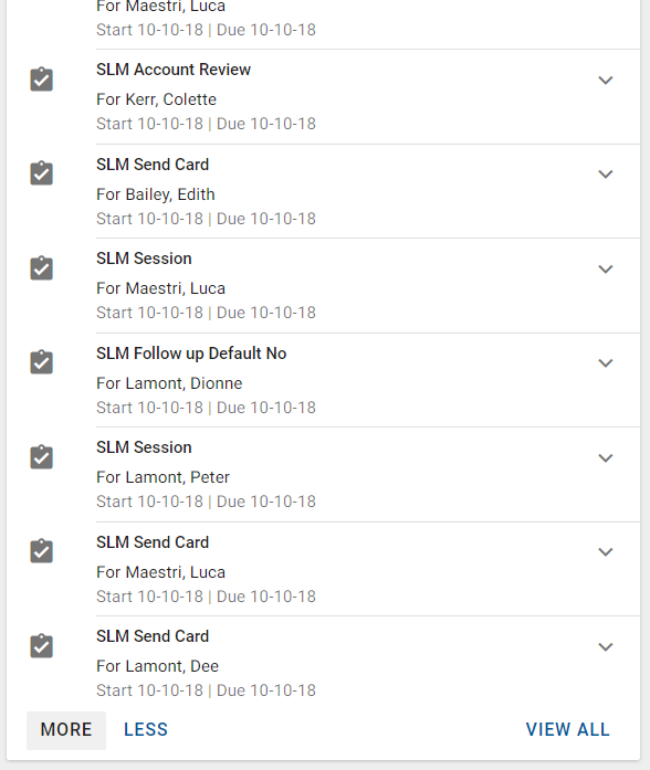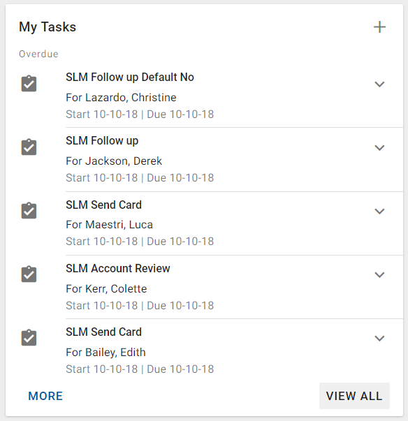 If there are additional items that can be displayed in the list, then the MORE button is displayed on the bottom left of the card. Optionally, the VIEW ALL button is displayed on the bottom right of the card.