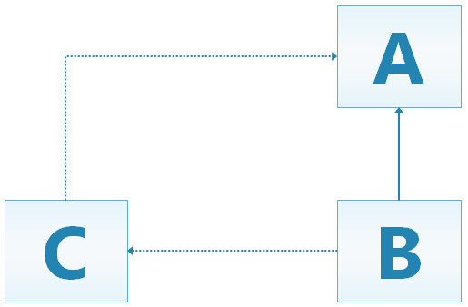 This model dependency will not result in a MetadataValidationException error. Although mixin rules state B is only allowed to override resources from C, not A, the inheritance rule states that B is allowed to override resources in A as it is immediately based on it. NexJ Framework handles this scenario without mixin conflicts.